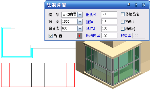 角凸窗:轉(zhuǎn)角窗和角凸窗統(tǒng)一為一個參數(shù)化窗對象,側(cè)面可以碰墻,自動完成側(cè)面的遮擋處理。