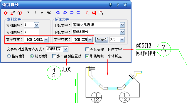 索引圓圈內(nèi)的文字支持出圈顯示,圈內(nèi)文字與線上標(biāo)注文字可以采用不同的文字樣式。按制圖規(guī)范要求增加對在延長線上標(biāo)注文字、多剖切位置線以及引線雙轉(zhuǎn)折點的支持。
