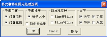 AutoCAD格式刷的基礎上增加了本軟件的專用功能;按熱鍵[Q]可以彈出“格式刷特殊圖元處理選項”對話框(如圖),在通過格式刷傳遞圖元特征時,這些選項可以改變:門窗的樣式、寬度、名稱;柱子的大小;LINE轉(zhuǎn)PLINEPLINE轉(zhuǎn)LINE;文字內(nèi)容、名稱、樣式。